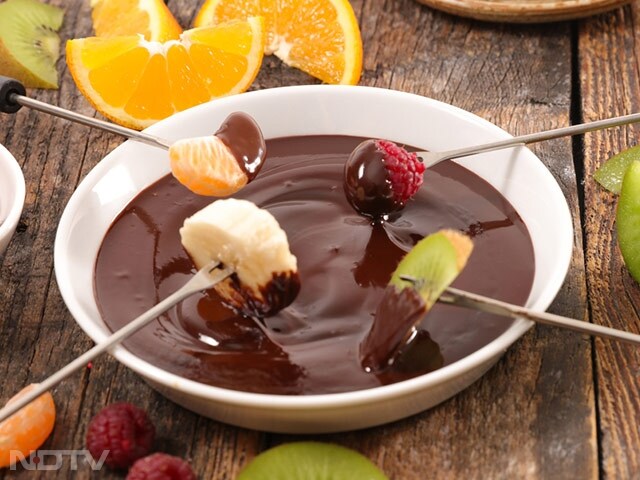 A communal dessert where bite-sized pieces of fruit, marshmallows, or cake are dipped into melted chocolate, creating a fun and interactive dining experience.