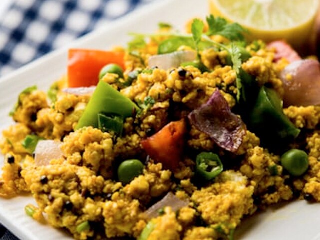 A plant-based version of paneer bhurji, this dish is ideal for vegans out there. Grated tofu is stirred in a pool of spices and chillies such as ginger-garlic paste, turmeric powder, and red chilli powder along with onions and tomatoes.