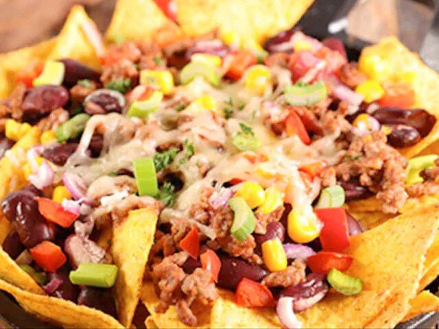 The crispy nachos, a traditional Mexican finger meal, are created with tortilla chips and topped with stir-fried chicken, peppers, jalapenos, and plenty of Mexican cheese. This recipe is a must-try.