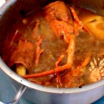 Into this, add the lobster heads and one more chopped raw mango.