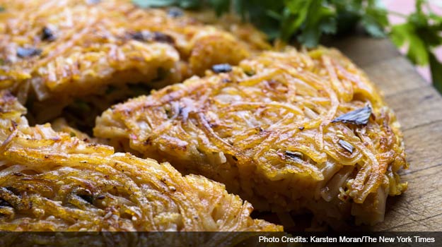 3. Set a heavy 12-inch skillet over medium-high heat. Add vegetable oil and heat until wavy. Slip in noodle mixture and cover. Turn heat to medium and cook for 5 minutes, until bottom is browned and crisp.